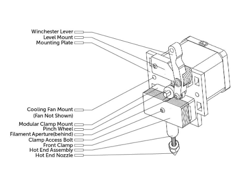On other FDM printers, there will be an equivalent piece of hardware providing tension against the pinch wheel. For example, the Type A Series 1 uses a Winchester lever, while the Airwolf uses a combination of a Quick Release Latch and a hobbed bolt.