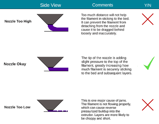 One common cause of jams is the nozzle being too close to the bed. This causes a portion of the filament to be pushed back into the nozzle, causing the filament to create reversed pressurized resistance. With 3D printing, the slightest change in height (down to the .1mm level) can determine whether the filament will even stick or if it is the start of a jam. To prevent this, check out the graphic and text below.